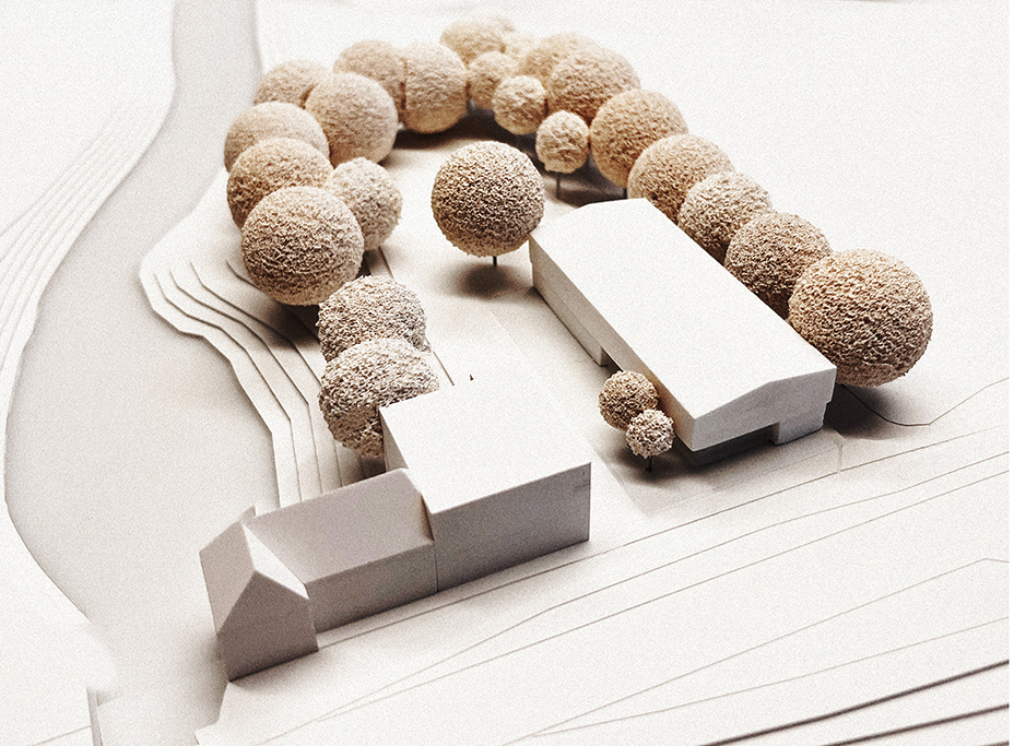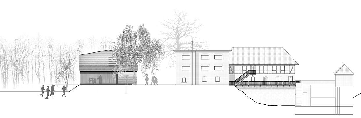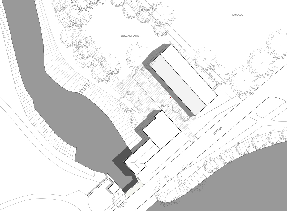 Neubau einer Musikschule . Die Entwurfsverfasser*Innen planen das Gebäude als Archetyp „Scheune“ in der Flucht der bestehenden Mühle. Durch die reduzierte Baumasse wird die Möglichkeit genutzt einen Platz zwischen Bestand und geplantem Haus der Musik neu zu gestalten (Platz der Musik).