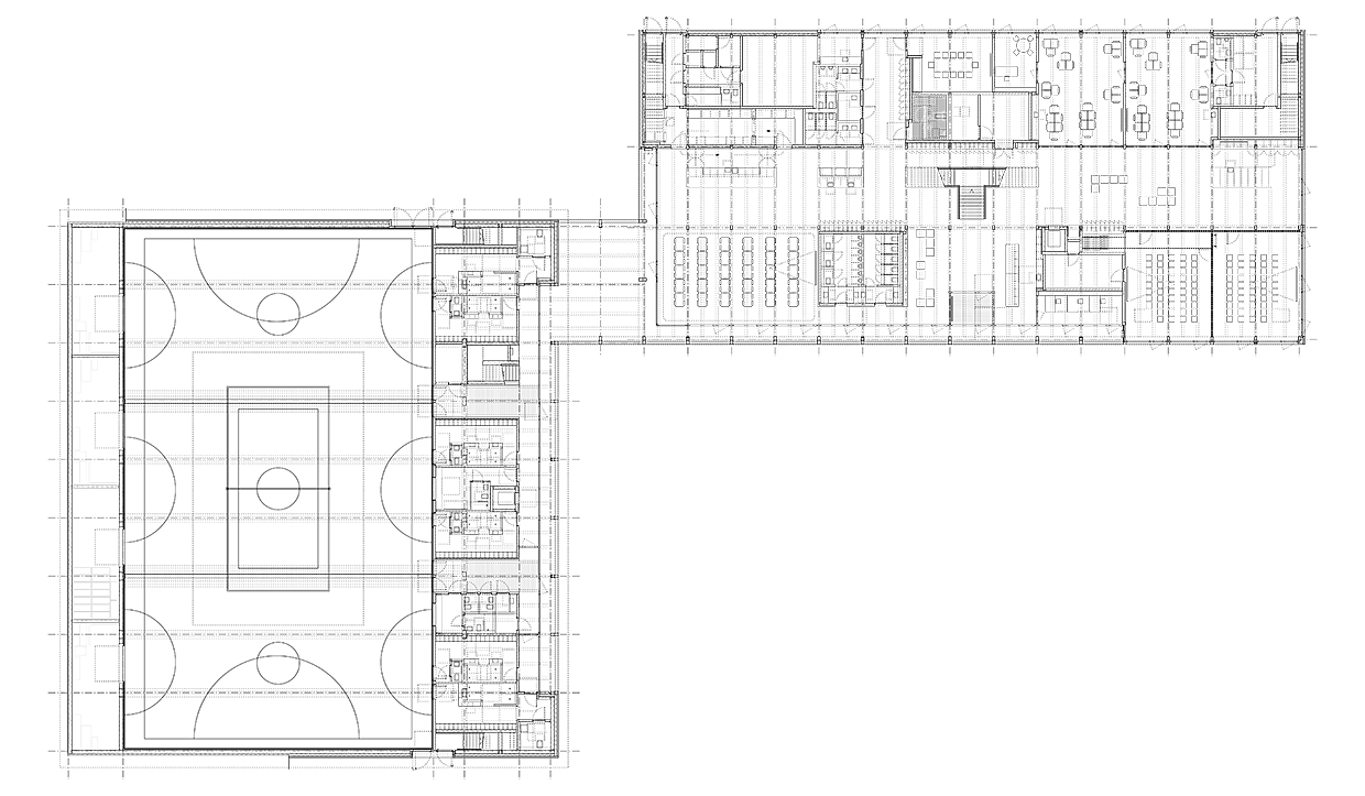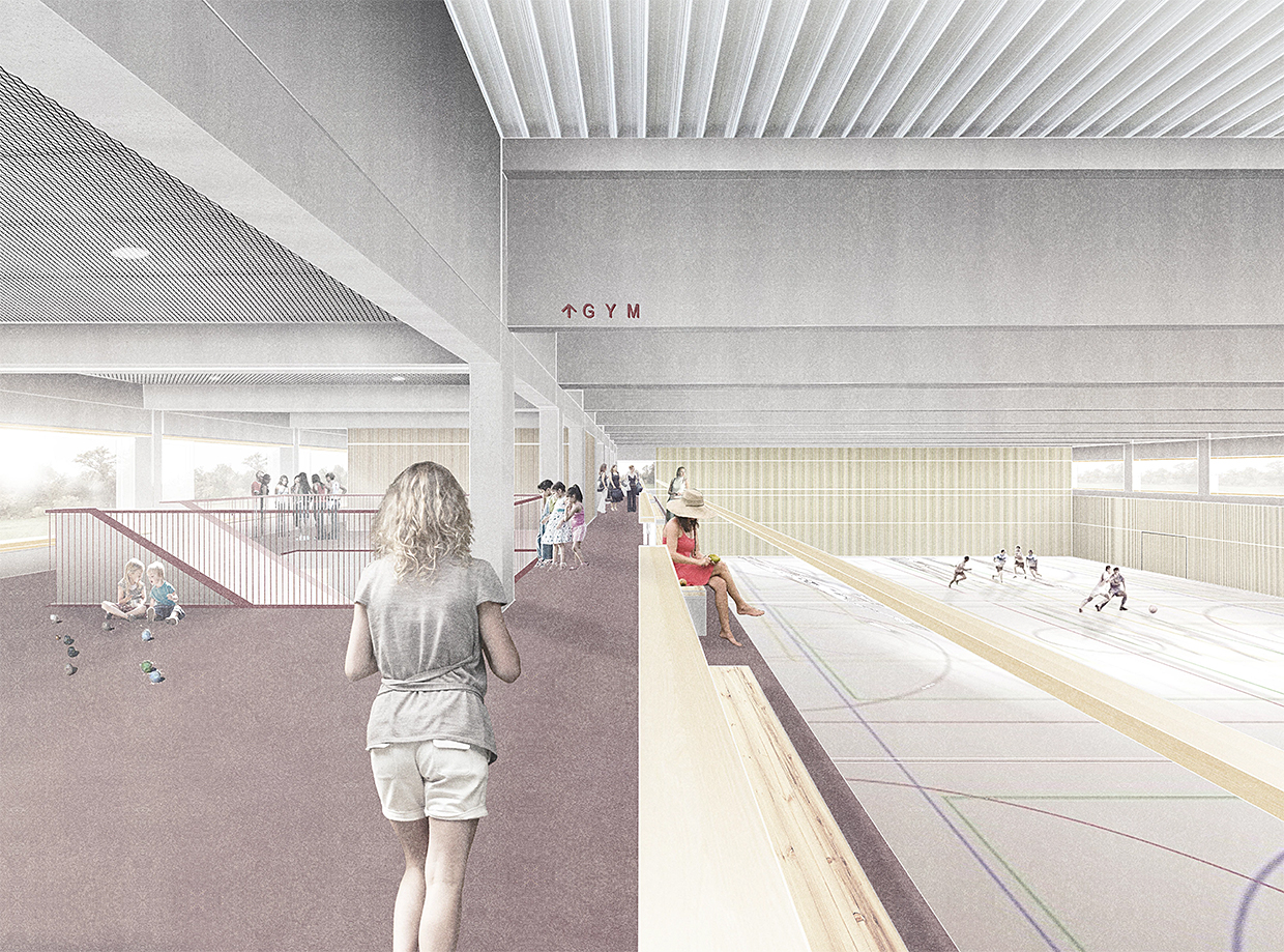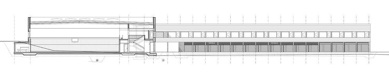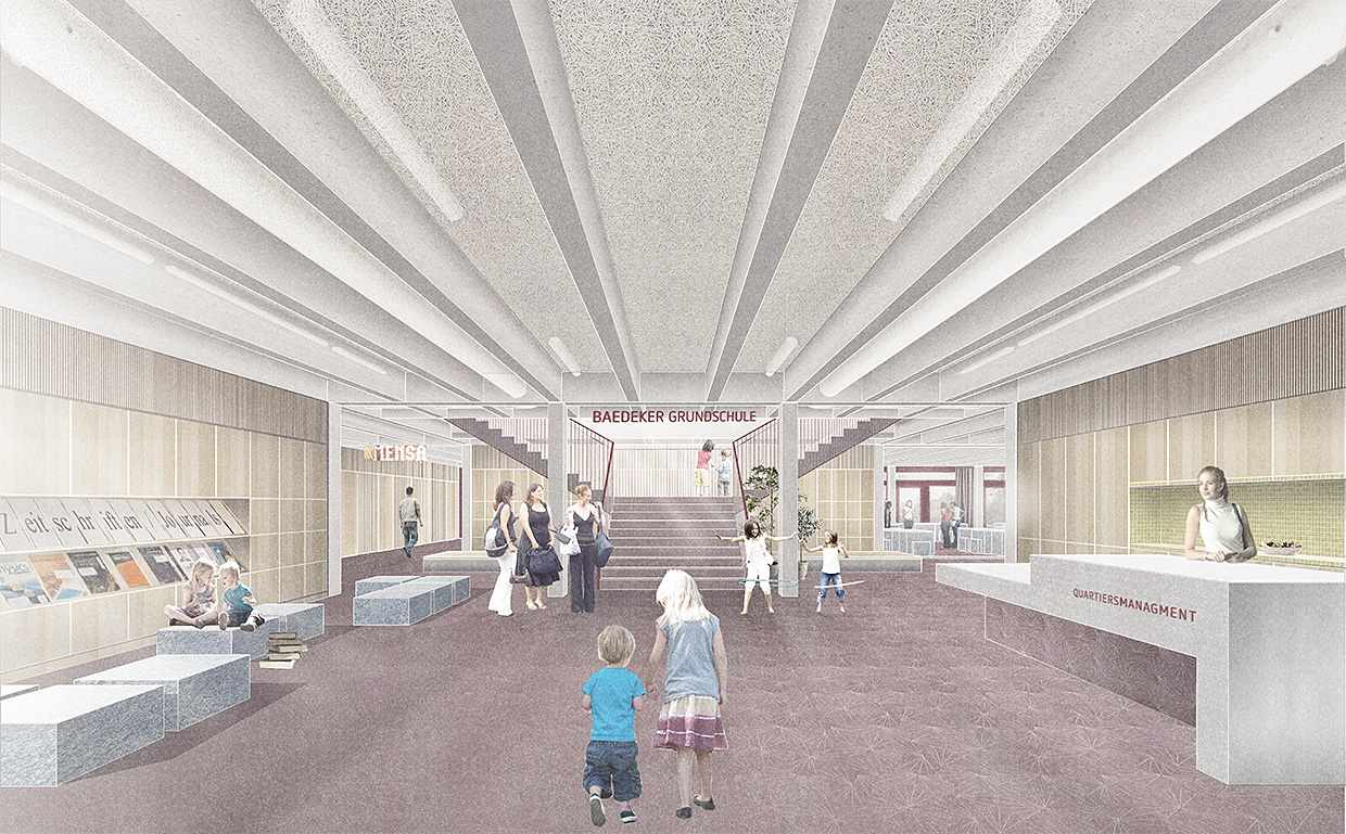Von einer zweizügigen Grundschule überbaut, bietet das Bildungsquartier Räume für den offenen Ganztagsbetrieb, eine Mensa, Gruppen- und Veranstaltungsräume für die Bevölkerung sowie Räumlichkeiten für verschiedene Akteure und Vereine vor Ort.