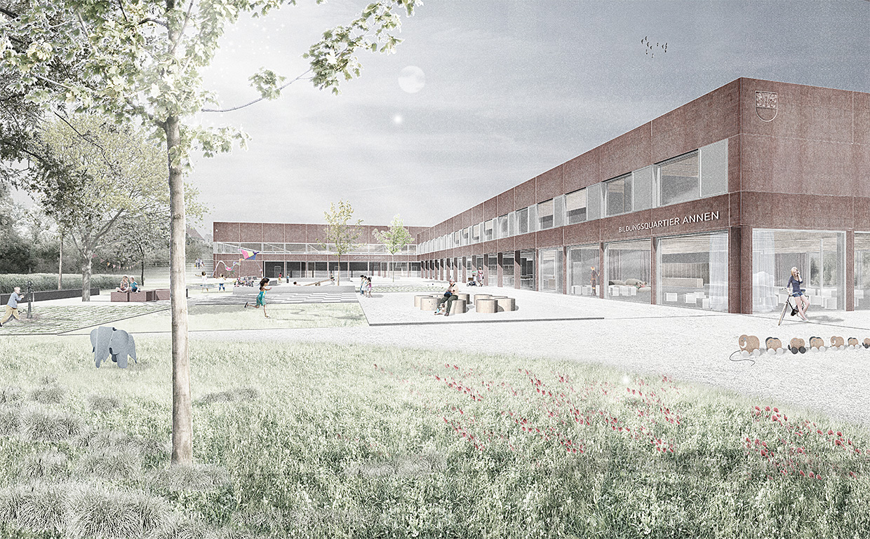 BQA Witten. Der Entwurf reagiert auf eine komplexe städtebauliche wie topografische Situation im Zentrum des Stadtteils Annen durch die Anordnung zweier im rechten Winkel zueinander stehender Baukörper, die obergeschossig miteinander verbunden sind. Neben einer in die Hangkante geschobenen Dreifachsporthalle mit Tribüne bildet das Bildungsquartier das eigentliche Herz der Bauaufgabe und des zukünftigen Lebens im Quartier.