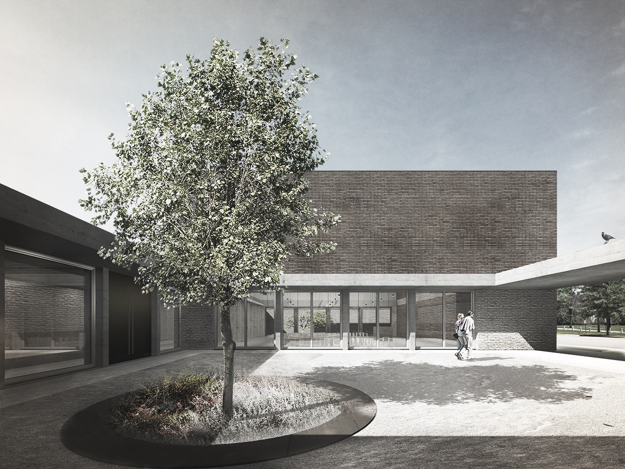 EVK Münster . Mit Abschluss der Ausfuehrungsplanung haben wir unsere Planung anhand der Renderings nochmals bebildert. Unter einem langgestreckten Baukoerper sind saemtliche Raeume des Kirchenzentrums um einen zu einer Gruenanlage orientierten Innenhof positioniert. Der Sakrale Raum entwickelt sich aus dem Dach und wird gemeinsam mit dem Glockenträger gut sichtbar im neuen Stadtraum in Erscheinung treten.