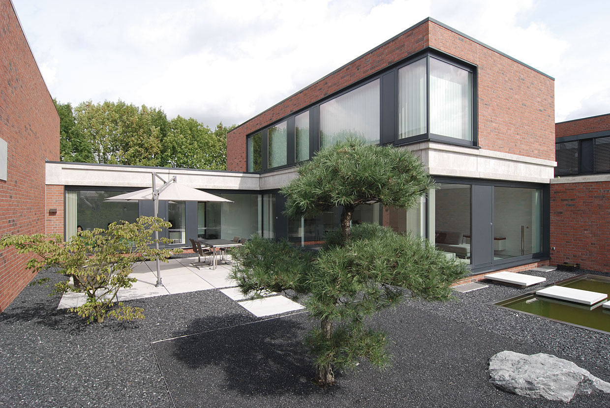Wohnanlage Münster . In einem Vorort von Münster entstanden vier Wohnhäuser in aufeinander abgestimmter Architektur in Form einer Aneinanderreihung als Hofhäuser.