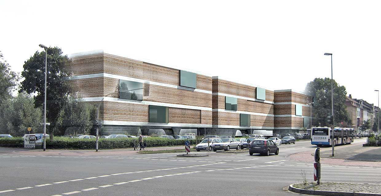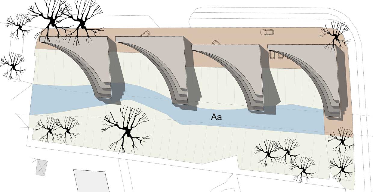 Wohnen an der Aa in Münster . Entwurfsstudie für nicht adäquat genutzte Grundstücke der Stadt Münster im Rahmen eines BDA-Workshops. KA haben einen derzeit als Parkplatz fehlgenutzten Standort in zentraler Lage von Münster geplant.